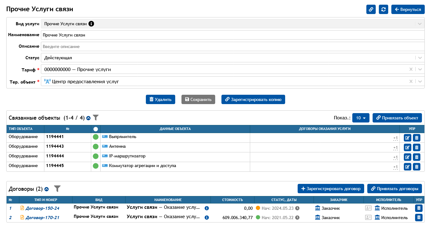Единый интерфейс сведений об услуге, включающих информацию о договорах и оборудовании конкретного территориального объекта