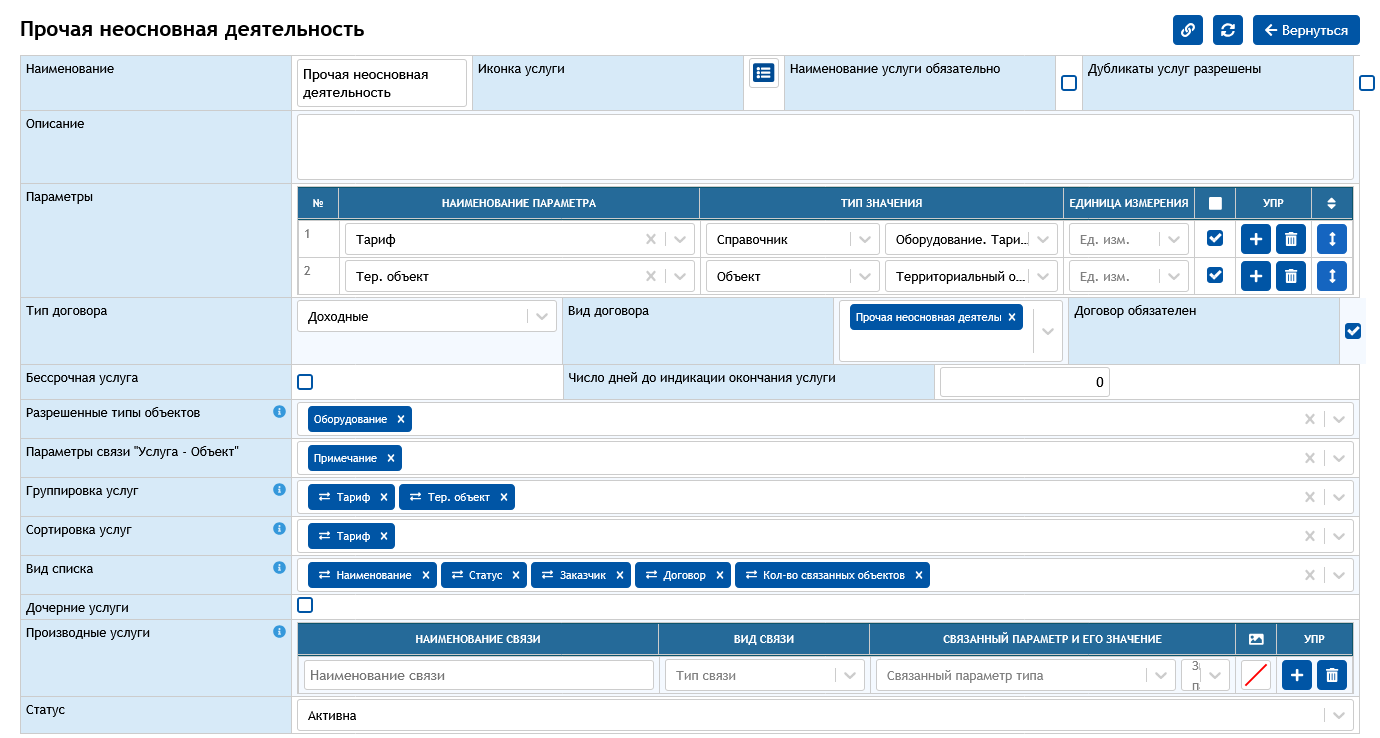 Конструктор характеристик услуги с гибкой настройкой типов объектов, взаимосвязей, дочерних и производных услуг, а также группировка и сортировка услуг по различным параметрам