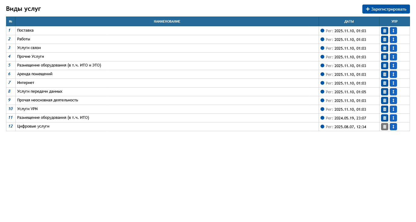 Управление каталогом различных видов услуг, обеспечивающих полноценную работу предприятия